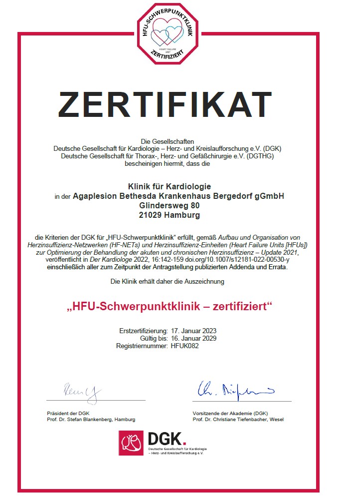 Die Herzinsuffizienz (Herzschwäche) ist eine häufige und schwerwiegende Erkrankung, die eine hochspezialisierte Behandlung erfordert. In der Regel liegt eine Pumpschwäche der linken Herzkammer, als Folge eines Herzinfarkts oder einer Herzmuskelentzündung vor. Das häufigste Symptom ist Luftnot, viele Betroffene klagen aber auch über Müdigkeit, Abgeschlagenheit und fehlende Belastbarkeit. Im Rahmen unserer zertifizierten Heart Failure Unit (HFU) haben wir uns auf die Behandlung von Patient:innen mit Herzinsuffizienz spezialisiert. In unserer HFU arbeiten Ärzte, speziell geschultes Pflegepersonal (Heart-Failure-Nurses) und weitere Fachkräfte eng zusammen, um eine individuelle umfassende und optimale Versorgung für Patient:innen mit Herzinsuffizienz zu gewährleisten.