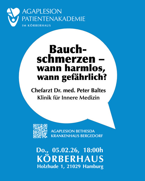 Chefarzt Dr. med. Peter Baltes der Klinik für Innere Medizin des AGAPLESION BETHESDA KRANKENHAUS BERGEDORF, informiert am 05.02.2026 um 18 Uhr über Bauchschmerzen und wann man sie wirklich ernst nehmen sollte.
