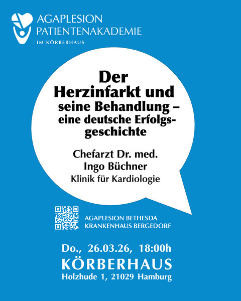 Chefarzt Dr. med. Ingo Büchnert der Klinik für Kardiologie des AGAPLESION BETHESDA KRANKENHAUS BERGEDORF, informiert am 26.03.2026 um 18 Uhr über den Herzinfarkt und seine Behandlungsmöglichkeiten.